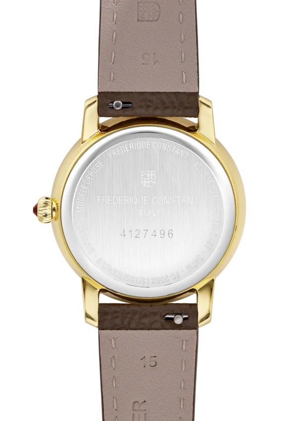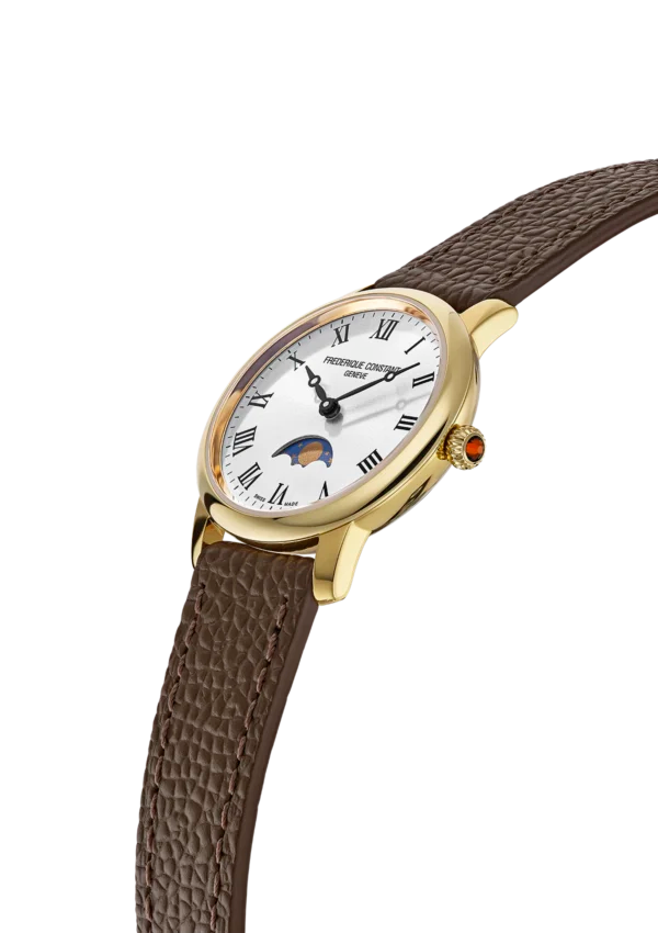 Découvrez la montre Classics Slimline Ladies Moonphase, une montre-bracelet raffinée qui célèbre la féminité avec une touche de poésie céleste. Son boîtier plaqué or jaune poli de 30 mm de diamètre et de 7.65 mm de hauteur abrite le mouvement à quartz FC-206, offrant une précision remarquable avec 5 rubis et une autonomie de batterie généreuse de 60 mois. Le cadran argenté, sublimé par une finition soleillée, est orné de chiffres romains noirs imprimés et d’élégantes aiguilles noires des heures et des minutes. La complication de phase de lune, positionnée à 6 heures, ajoute une dimension onirique à cette pièce. Protégée par un verre saphir convexe antireflet et étanche jusqu’à 3 ATM (30m/100ft), cette montre est complétée par un bracelet en cuir de veau marron foncé embossé d’un motif crocodile, fermé par une boucle ardillon, pour un style et un confort inégalés.
