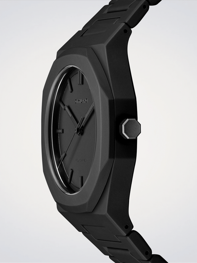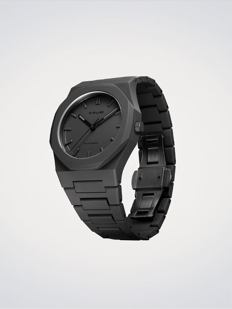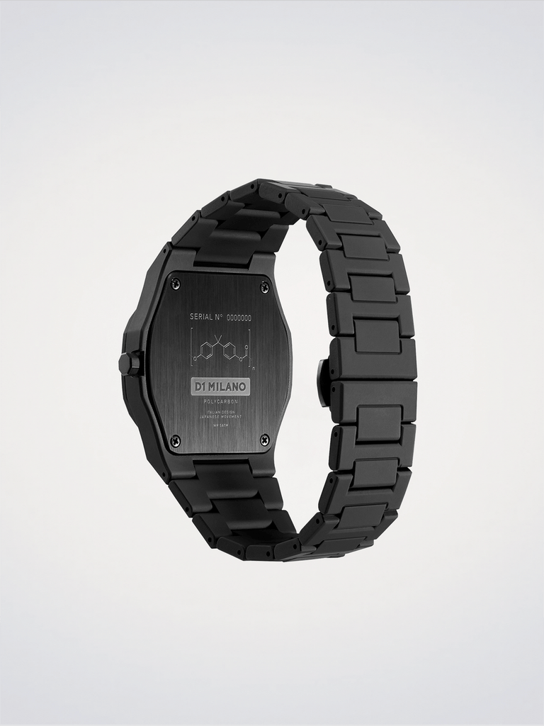 The first characteristic of an iconic product is its expressive power, its ability to stand out from the crowd and be instantly recognisable. And it was with this clear vision in mind that we created Polycarbon. An unexpected material, polycarbonate, made pleasant and soft to the touch by a soft-touch surface finish that makes it comfortable to wear. The extreme monochromatism makes it immediately recognisable, being a watch that breaks the rules of watchmaking.