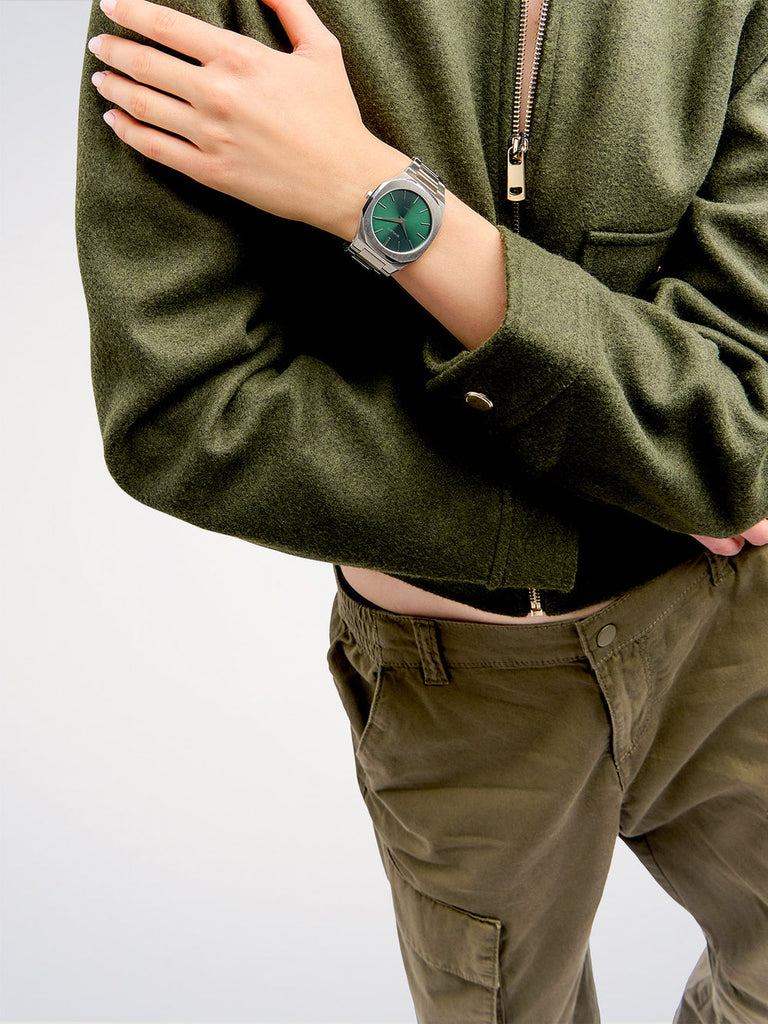 The standout detail is undoubtedly the moss-toned dial, enriched with a linen-like texture featuring diagonal lines.