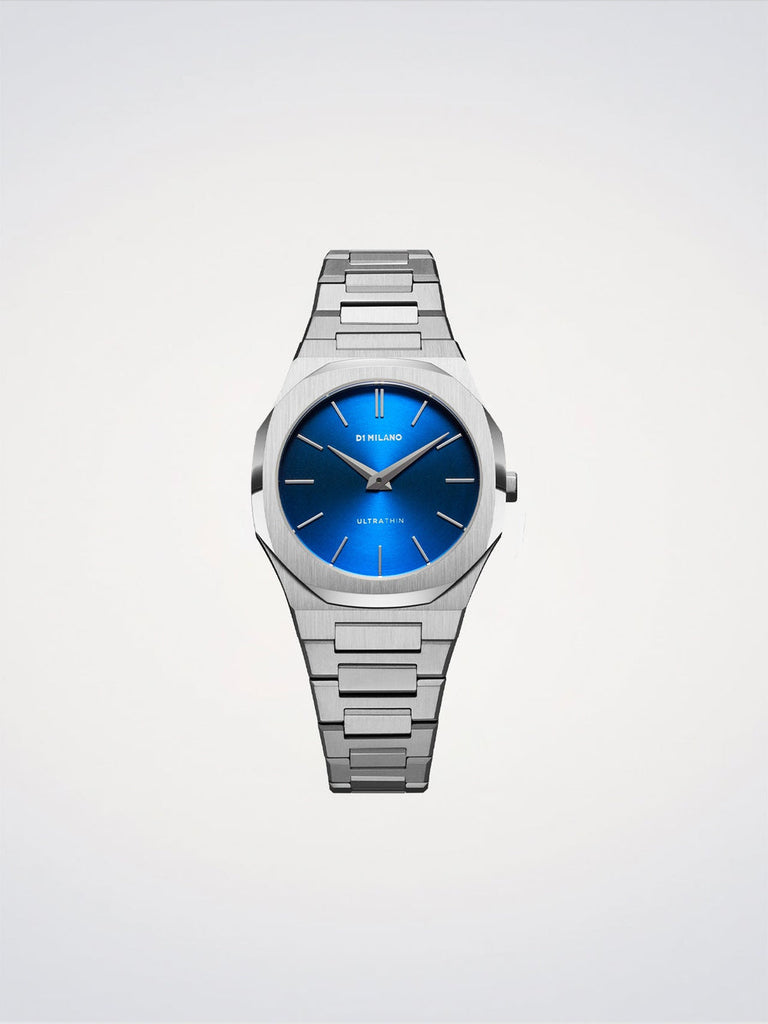 With a case and a bracelet made of 316L silver stainless steel, this petite accessory is enhanced by a bright blue dial with a soleil finishing.