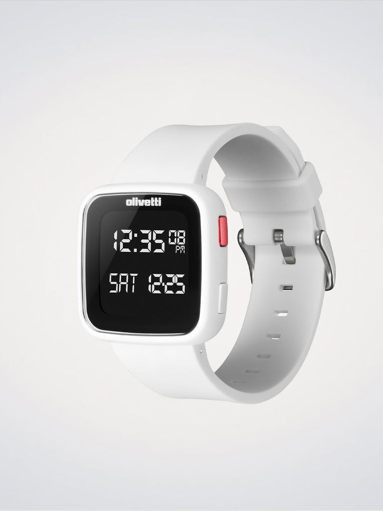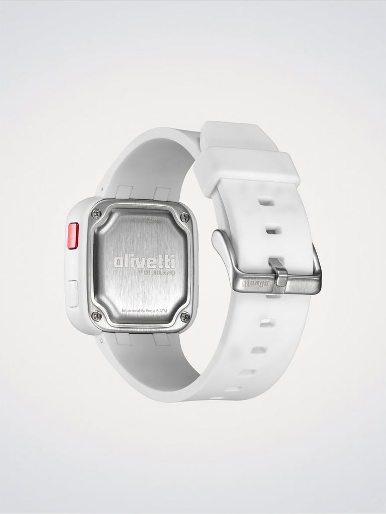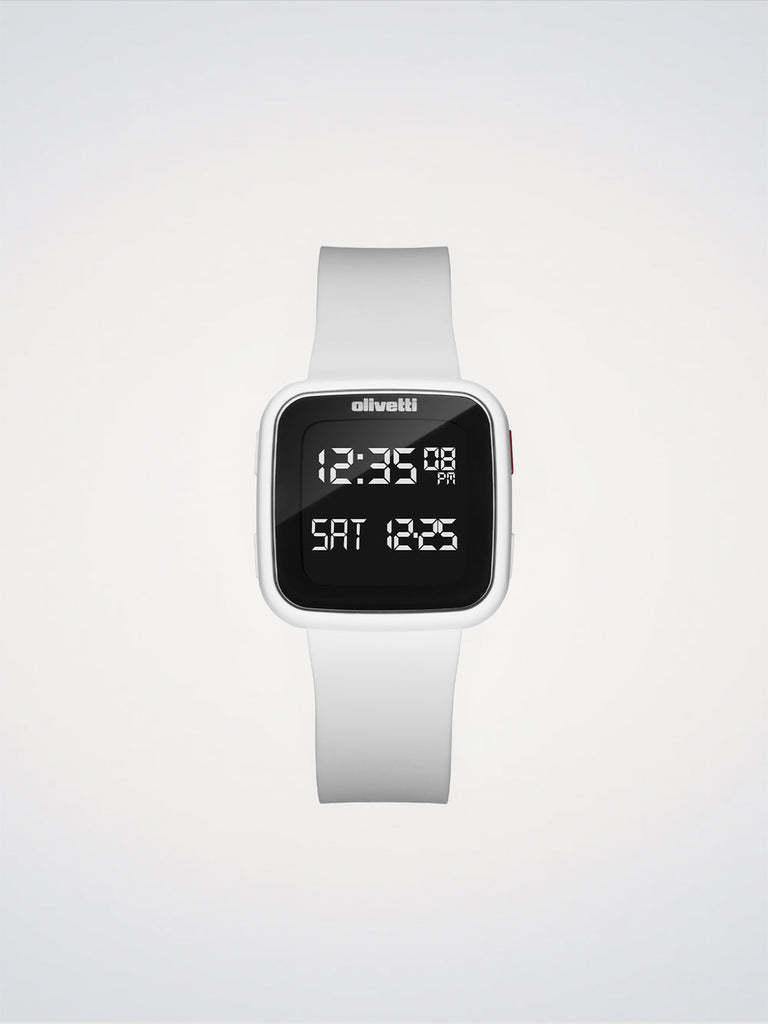 The white-colored case is made of polycarbonate, and the digital dial allows optimal display of the time and its many functions.