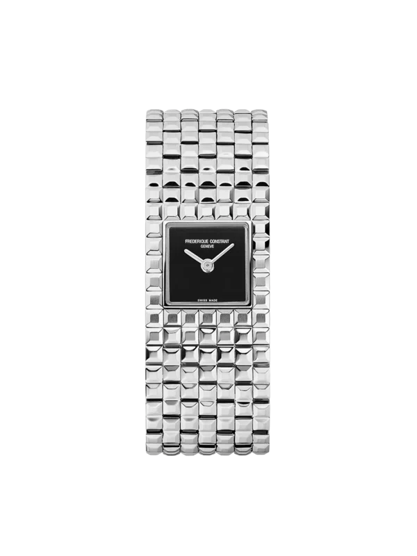 Ici, le style prime. Frédérique Constant n’a donc fait aucune concession. Le motif « Clou de Paris » habille toute la montre d’une myriade de carrés scintillants et polis, avec finition brossée au sommet de chaque maillon. En leur centre se niche un discret cadran survolé des seules aiguilles des heures et minutes.
