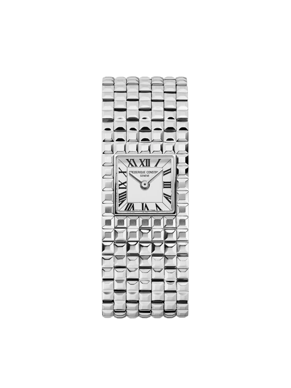 Ici, le style prime. Frédérique Constant n’a donc fait aucune concession. Le motif « Clou de Paris » habille toute la montre d’une myriade de carrés scintillants et polis, avec finition brossée au sommet de chaque maillon. En leur centre se niche un discret cadran survolé des seules aiguilles des heures et minutes.