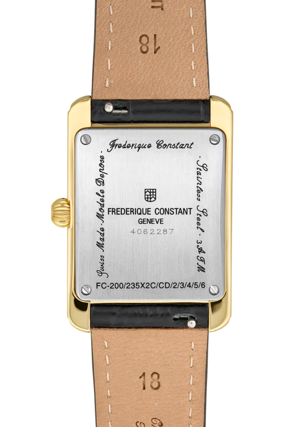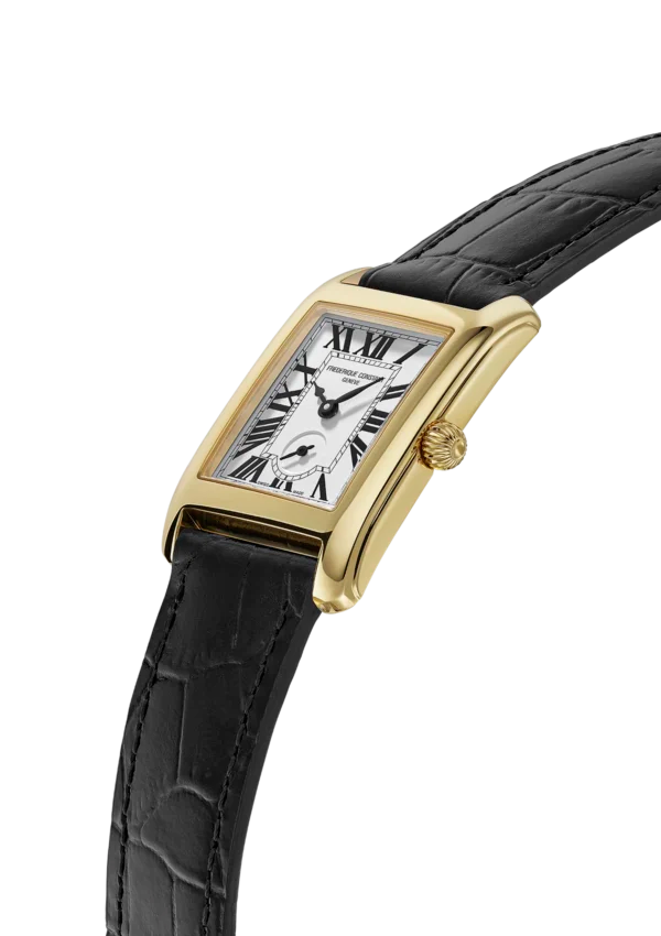 Le boîtier rectangulaire renferme un cadran avec minuterie également rectangulaire, où s’insère à 6h une petite seconde indépendante. Elle se détache du cadran par un léger plan creux. Tout autour, les heures s’égrènent en larges chiffres romains, le long d’une minuterie « sector dial », ou chemin de fer, typique de la Belle Époque. Il en va de même de leur couronne oignon, clin d’œil aux montres de poche que ces montres-bracelets commençaient doucement à reléguer en arrière de l’histoire.
