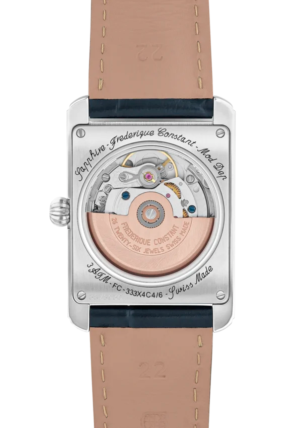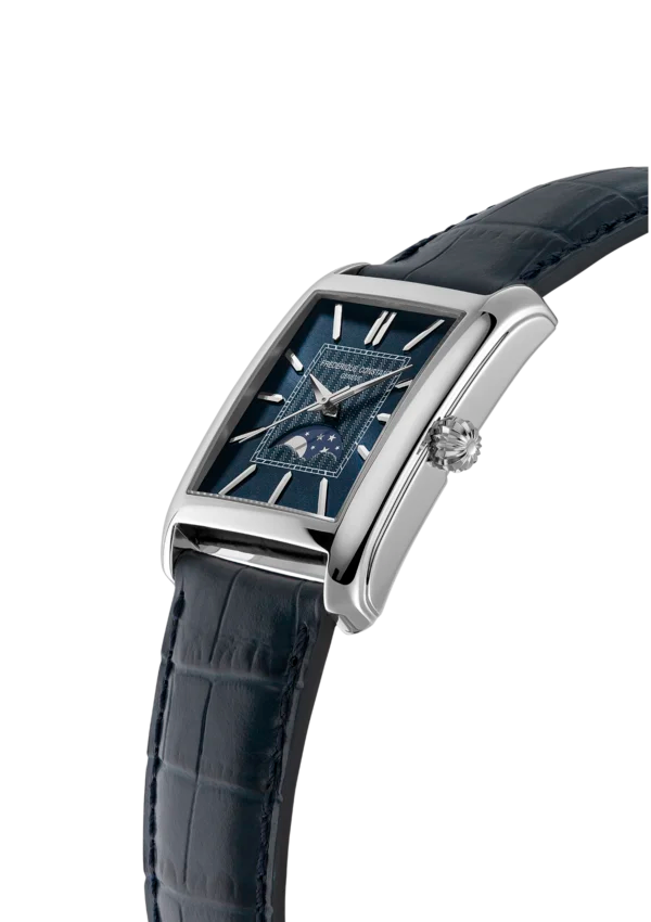 Plongez au cœur du design Art Déco des années 20 et 30 avec la Classics Carrée Moonphase Automatic. Pour la première fois, ce modèle iconique révèle la complication poétique de la phase de Lune seule à 6h. Son boîtier rectangulaire en acier poli encadre un hypnotique cadran bleu marine soleillé rehaussé d’un délicat guilloché à chevrons. Au centre, la Lune et les étoiles s’affichent sur un envoûtant fond bleu astral. Animée par le calibre automatique FC-333, elle est l’incarnation d’une élégance intemporelle.
