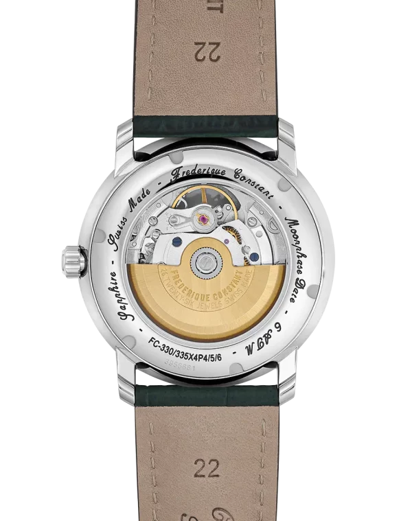 Découvrez la montre Classics Heart Beat Moonphase Date, une pièce horlogère sophistiquée qui dévoile l’âme de son mouvement. Son boîtier poli en acier inoxydable de 40 mm abrite le calibre automatique FC-335, offrant une réserve de marche de 38 heures et une fréquence de 28’800 alt/h, visible à travers la fenêtre « Heart Beat » à 12 heures. Le cadran vert mat est rehaussé par un élégant guilloché « Clous de Paris » en son centre, des chiffres romains blancs imprimés et une graduation de la date sur le pourtour. Les aiguilles blanches des heures, minutes, secondes et de la date garantissent une lisibilité optimale, tandis que la phase de lune ajoute une touche de poésie. Protégée par un verre saphir convexe anti-reflets et un fond de boîtier transparent, cette montre est étanche jusqu’à 6 ATM (60m/197ft) et s’accompagne d’un bracelet en cuir de veau vert avec surpiqûres écrus, mariant élégance classique et confort.