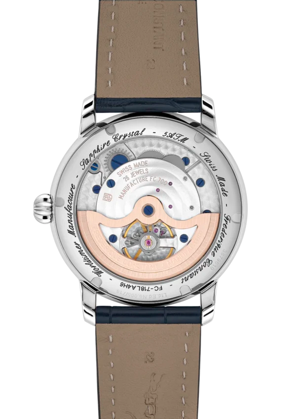 Au cœur de la montre bat le calibre automatique de Manufacture FC-718, un mouvement entièrement développé et assemblé par nos soins en interne. Ce mécanisme est particulièrement remarquable car toutes ses fonctions — heures, minutes, secondes, date par aiguille et Worldtimer — sont ajustables via la couronne unique, ce qui simplifie la manipulation pour le voyageur moderne.