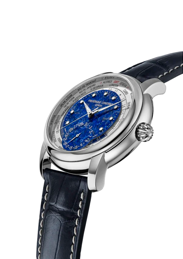 The in-house self-winding FC-718 mechanical movement has a power reserve of 38 hours. Highly user-friendly, its single crown can be used to set any function: hours, minutes, the date at 6 o’clock and the 24 cities disc that represents 24 time zones on Earth, itself engraved in the centre of the piece. There is no day/night indicator required; the inner disc has been engraved with 12 hours on the light area (cities where it is daytime) and 12 hours on the blue area (those where it is night-time).