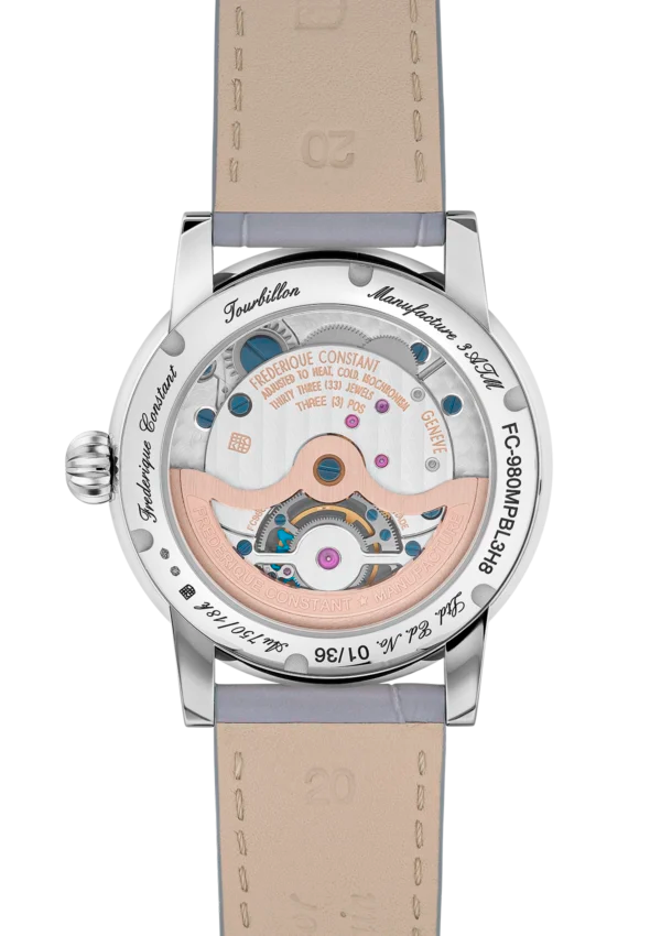 Le boîtier en or blanc 18 carats de 39 mm, poli miroir, offre un écrin précieux à la nacre irisée. Il est sublimé par un bracelet en alligator bleu clair à boucle déployante. Ce minimalisme sophistiqué, accentué par les discrètes signatures « Frédérique Constant – Genève – Swiss Made », met en valeur la quintessence du cadran et la complexité du tourbillon.